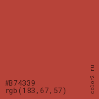 Цвет #B74339 в цветовой модели RGB обозначается тремя октетами (183, 67, 57) в десятичном формате и #B74339 в шестнадцатиричном (hex) формате, которые являются интенсивностью красного 183 (hex B7), интенсивность зелёного 67 (hex 43) и интенсивность синего 57 (hex 39).