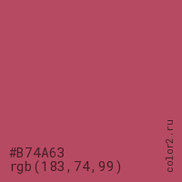 Цвет #B74A63 в цветовой модели RGB обозначается тремя октетами (183, 74, 99) в десятичном формате и #B74A63 в шестнадцатиричном (hex) формате, которые являются интенсивностью красного 183 (hex B7), интенсивность зелёного 74 (hex 4A) и интенсивность синего 99 (hex 63).