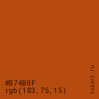 Цвет #B74B0F в цветовой модели RGB обозначается тремя октетами (183, 75, 15) в десятичном формате и #B74B0F в шестнадцатиричном (hex) формате, которые являются интенсивностью красного 183 (hex B7), интенсивность зелёного 75 (hex 4B) и интенсивность синего 15 (hex 0F).