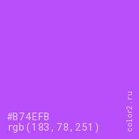 Цвет RGB(183, 78, 251) в процентом отношении количества цвета состоит из 71.8% красного (red), 30.6% зелёного (green) и 98.4% синего (blue).