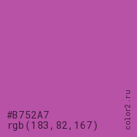 Цвет #B752A7 в цветовой модели RGB обозначается тремя октетами (183, 82, 167) в десятичном формате и #B752A7 в шестнадцатиричном (hex) формате, которые являются интенсивностью красного 183 (hex B7), интенсивность зелёного 82 (hex 52) и интенсивность синего 167 (hex A7).