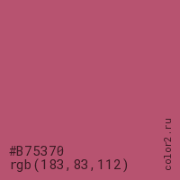 Цвет #B75370 в цветовой модели RGB обозначается тремя октетами (183, 83, 112) в десятичном формате и #B75370 в шестнадцатиричном (hex) формате, которые являются интенсивностью красного 183 (hex B7), интенсивность зелёного 83 (hex 53) и интенсивность синего 112 (hex 70).