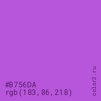 Цвет #B756DA в цветовой модели RGB обозначается тремя октетами (183, 86, 218) в десятичном формате и #B756DA в шестнадцатиричном (hex) формате, которые являются интенсивностью красного 183 (hex B7), интенсивность зелёного 86 (hex 56) и интенсивность синего 218 (hex DA).