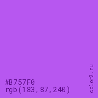 Цвет #B757F0 в цветовой модели RGB обозначается тремя октетами (183, 87, 240) в десятичном формате и #B757F0 в шестнадцатиричном (hex) формате, которые являются интенсивностью красного 183 (hex B7), интенсивность зелёного 87 (hex 57) и интенсивность синего 240 (hex F0).