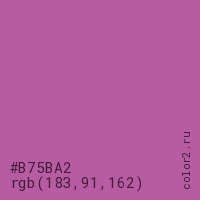 Цвет #B75BA2 в цветовой модели RGB обозначается тремя октетами (183, 91, 162) в десятичном формате и #B75BA2 в шестнадцатиричном (hex) формате, которые являются интенсивностью красного 183 (hex B7), интенсивность зелёного 91 (hex 5B) и интенсивность синего 162 (hex A2).