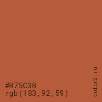 Цвет #B75C3B в цветовой модели RGB обозначается тремя октетами (183, 92, 59) в десятичном формате и #B75C3B в шестнадцатиричном (hex) формате, которые являются интенсивностью красного 183 (hex B7), интенсивность зелёного 92 (hex 5C) и интенсивность синего 59 (hex 3B).