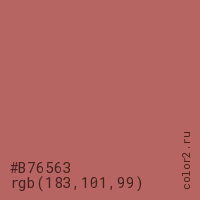 Цвет #B76563 в цветовой модели RGB обозначается тремя октетами (183, 101, 99) в десятичном формате и #B76563 в шестнадцатиричном (hex) формате, которые являются интенсивностью красного 183 (hex B7), интенсивность зелёного 101 (hex 65) и интенсивность синего 99 (hex 63).