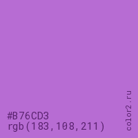 Цвет #B76CD3 в цветовой модели RGB обозначается тремя октетами (183, 108, 211) в десятичном формате и #B76CD3 в шестнадцатиричном (hex) формате, которые являются интенсивностью красного 183 (hex B7), интенсивность зелёного 108 (hex 6C) и интенсивность синего 211 (hex D3).
