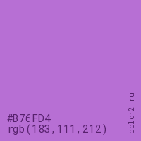 Цвет #B76FD4 в цветовой модели RGB обозначается тремя октетами (183, 111, 212) в десятичном формате и #B76FD4 в шестнадцатиричном (hex) формате, которые являются интенсивностью красного 183 (hex B7), интенсивность зелёного 111 (hex 6F) и интенсивность синего 212 (hex D4).