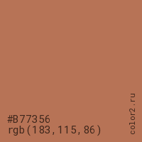 Цвет #B77356 в цветовой модели RGB обозначается тремя октетами (183, 115, 86) в десятичном формате и #B77356 в шестнадцатиричном (hex) формате, которые являются интенсивностью красного 183 (hex B7), интенсивность зелёного 115 (hex 73) и интенсивность синего 86 (hex 56).