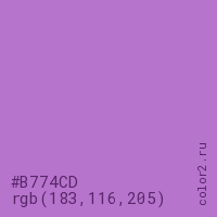 Цвет #B774CD в цветовой модели RGB обозначается тремя октетами (183, 116, 205) в десятичном формате и #B774CD в шестнадцатиричном (hex) формате, которые являются интенсивностью красного 183 (hex B7), интенсивность зелёного 116 (hex 74) и интенсивность синего 205 (hex CD).