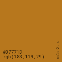 Цвет #B7771D в цветовой модели RGB обозначается тремя октетами (183, 119, 29) в десятичном формате и #B7771D в шестнадцатиричном (hex) формате, которые являются интенсивностью красного 183 (hex B7), интенсивность зелёного 119 (hex 77) и интенсивность синего 29 (hex 1D).