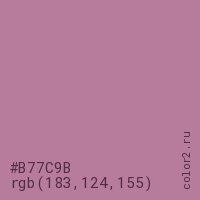 Цвет #B77C9B в цветовой модели RGB обозначается тремя октетами (183, 124, 155) в десятичном формате и #B77C9B в шестнадцатиричном (hex) формате, которые являются интенсивностью красного 183 (hex B7), интенсивность зелёного 124 (hex 7C) и интенсивность синего 155 (hex 9B).