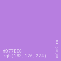 Цвет #B77EE0 в цветовой модели RGB обозначается тремя октетами (183, 126, 224) в десятичном формате и #B77EE0 в шестнадцатиричном (hex) формате, которые являются интенсивностью красного 183 (hex B7), интенсивность зелёного 126 (hex 7E) и интенсивность синего 224 (hex E0).