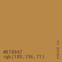 Цвет #B78847 в цветовой модели RGB обозначается тремя октетами (183, 136, 71) в десятичном формате и #B78847 в шестнадцатиричном (hex) формате, которые являются интенсивностью красного 183 (hex B7), интенсивность зелёного 136 (hex 88) и интенсивность синего 71 (hex 47).