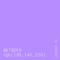 Цвет #B78DFD в цветовой модели RGB обозначается тремя октетами (183, 141, 253) в десятичном формате и #B78DFD в шестнадцатиричном (hex) формате, которые являются интенсивностью красного 183 (hex B7), интенсивность зелёного 141 (hex 8D) и интенсивность синего 253 (hex FD).