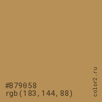 Цвет #B79058 в цветовой модели RGB обозначается тремя октетами (183, 144, 88) в десятичном формате и #B79058 в шестнадцатиричном (hex) формате, которые являются интенсивностью красного 183 (hex B7), интенсивность зелёного 144 (hex 90) и интенсивность синего 88 (hex 58).