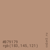 Цвет #B79179 в цветовой модели RGB обозначается тремя октетами (183, 145, 121) в десятичном формате и #B79179 в шестнадцатиричном (hex) формате, которые являются интенсивностью красного 183 (hex B7), интенсивность зелёного 145 (hex 91) и интенсивность синего 121 (hex 79).