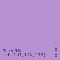 Цвет #B792D0 в цветовой модели RGB обозначается тремя октетами (183, 146, 208) в десятичном формате и #B792D0 в шестнадцатиричном (hex) формате, которые являются интенсивностью красного 183 (hex B7), интенсивность зелёного 146 (hex 92) и интенсивность синего 208 (hex D0).
