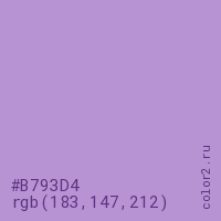 Цвет #B793D4 в цветовой модели RGB обозначается тремя октетами (183, 147, 212) в десятичном формате и #B793D4 в шестнадцатиричном (hex) формате, которые являются интенсивностью красного 183 (hex B7), интенсивность зелёного 147 (hex 93) и интенсивность синего 212 (hex D4).