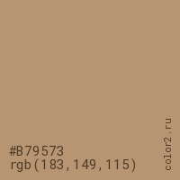 Цвет #B79573 в цветовой модели RGB обозначается тремя октетами (183, 149, 115) в десятичном формате и #B79573 в шестнадцатиричном (hex) формате, которые являются интенсивностью красного 183 (hex B7), интенсивность зелёного 149 (hex 95) и интенсивность синего 115 (hex 73).
