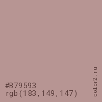 Цвет #B79593 в цветовой модели RGB обозначается тремя октетами (183, 149, 147) в десятичном формате и #B79593 в шестнадцатиричном (hex) формате, которые являются интенсивностью красного 183 (hex B7), интенсивность зелёного 149 (hex 95) и интенсивность синего 147 (hex 93).