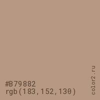 Цвет #B79882 в цветовой модели RGB обозначается тремя октетами (183, 152, 130) в десятичном формате и #B79882 в шестнадцатиричном (hex) формате, которые являются интенсивностью красного 183 (hex B7), интенсивность зелёного 152 (hex 98) и интенсивность синего 130 (hex 82).