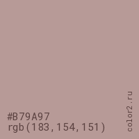 Цвет #B79A97 в цветовой модели RGB обозначается тремя октетами (183, 154, 151) в десятичном формате и #B79A97 в шестнадцатиричном (hex) формате, которые являются интенсивностью красного 183 (hex B7), интенсивность зелёного 154 (hex 9A) и интенсивность синего 151 (hex 97).