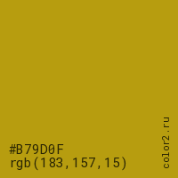 Цвет #B79D0F в цветовой модели RGB обозначается тремя октетами (183, 157, 15) в десятичном формате и #B79D0F в шестнадцатиричном (hex) формате, которые являются интенсивностью красного 183 (hex B7), интенсивность зелёного 157 (hex 9D) и интенсивность синего 15 (hex 0F).