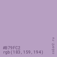 Цвет #B79FC2 в цветовой модели RGB обозначается тремя октетами (183, 159, 194) в десятичном формате и #B79FC2 в шестнадцатиричном (hex) формате, которые являются интенсивностью красного 183 (hex B7), интенсивность зелёного 159 (hex 9F) и интенсивность синего 194 (hex C2).