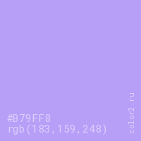 Цвет #B79FF8 в цветовой модели RGB обозначается тремя октетами (183, 159, 248) в десятичном формате и #B79FF8 в шестнадцатиричном (hex) формате, которые являются интенсивностью красного 183 (hex B7), интенсивность зелёного 159 (hex 9F) и интенсивность синего 248 (hex F8).