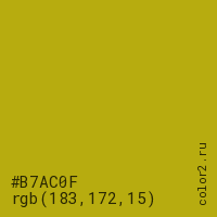 Цвет #B7AC0F в цветовой модели RGB обозначается тремя октетами (183, 172, 15) в десятичном формате и #B7AC0F в шестнадцатиричном (hex) формате, которые являются интенсивностью красного 183 (hex B7), интенсивность зелёного 172 (hex AC) и интенсивность синего 15 (hex 0F).