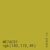 Цвет #B7AC31 в цветовой модели RGB обозначается тремя октетами (183, 172, 49) в десятичном формате и #B7AC31 в шестнадцатиричном (hex) формате, которые являются интенсивностью красного 183 (hex B7), интенсивность зелёного 172 (hex AC) и интенсивность синего 49 (hex 31).