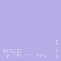 Цвет #B7ACE6 в цветовой модели RGB обозначается тремя октетами (183, 172, 230) в десятичном формате и #B7ACE6 в шестнадцатиричном (hex) формате, которые являются интенсивностью красного 183 (hex B7), интенсивность зелёного 172 (hex AC) и интенсивность синего 230 (hex E6).