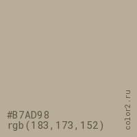 Цвет #B7AD98 в цветовой модели RGB обозначается тремя октетами (183, 173, 152) в десятичном формате и #B7AD98 в шестнадцатиричном (hex) формате, которые являются интенсивностью красного 183 (hex B7), интенсивность зелёного 173 (hex AD) и интенсивность синего 152 (hex 98).