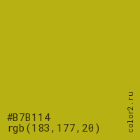Цвет #B7B114 в цветовой модели RGB обозначается тремя октетами (183, 177, 20) в десятичном формате и #B7B114 в шестнадцатиричном (hex) формате, которые являются интенсивностью красного 183 (hex B7), интенсивность зелёного 177 (hex B1) и интенсивность синего 20 (hex 14).
