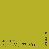 Цвет #B7B128 в цветовой модели RGB обозначается тремя октетами (183, 177, 40) в десятичном формате и #B7B128 в шестнадцатиричном (hex) формате, которые являются интенсивностью красного 183 (hex B7), интенсивность зелёного 177 (hex B1) и интенсивность синего 40 (hex 28).
