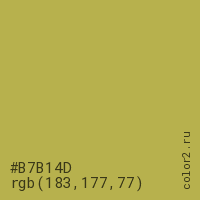 Цвет #B7B14D в цветовой модели RGB обозначается тремя октетами (183, 177, 77) в десятичном формате и #B7B14D в шестнадцатиричном (hex) формате, которые являются интенсивностью красного 183 (hex B7), интенсивность зелёного 177 (hex B1) и интенсивность синего 77 (hex 4D).
