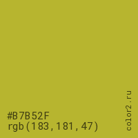 Цвет #B7B52F в цветовой модели RGB обозначается тремя октетами (183, 181, 47) в десятичном формате и #B7B52F в шестнадцатиричном (hex) формате, которые являются интенсивностью красного 183 (hex B7), интенсивность зелёного 181 (hex B5) и интенсивность синего 47 (hex 2F).