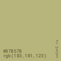 Цвет #B7B57B в цветовой модели RGB обозначается тремя октетами (183, 181, 123) в десятичном формате и #B7B57B в шестнадцатиричном (hex) формате, которые являются интенсивностью красного 183 (hex B7), интенсивность зелёного 181 (hex B5) и интенсивность синего 123 (hex 7B).