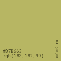 Цвет #B7B663 в цветовой модели RGB обозначается тремя октетами (183, 182, 99) в десятичном формате и #B7B663 в шестнадцатиричном (hex) формате, которые являются интенсивностью красного 183 (hex B7), интенсивность зелёного 182 (hex B6) и интенсивность синего 99 (hex 63).