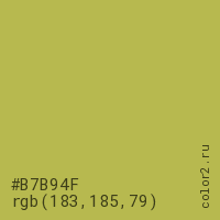 Цвет #B7B94F в цветовой модели RGB обозначается тремя октетами (183, 185, 79) в десятичном формате и #B7B94F в шестнадцатиричном (hex) формате, которые являются интенсивностью красного 183 (hex B7), интенсивность зелёного 185 (hex B9) и интенсивность синего 79 (hex 4F).