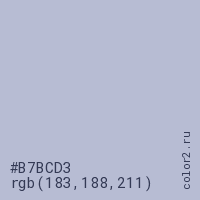 Цвет #B7BCD3 в цветовой модели RGB обозначается тремя октетами (183, 188, 211) в десятичном формате и #B7BCD3 в шестнадцатиричном (hex) формате, которые являются интенсивностью красного 183 (hex B7), интенсивность зелёного 188 (hex BC) и интенсивность синего 211 (hex D3).