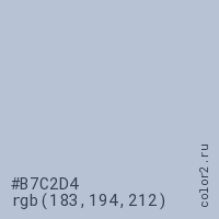 Цвет #B7C2D4 в цветовой модели RGB обозначается тремя октетами (183, 194, 212) в десятичном формате и #B7C2D4 в шестнадцатиричном (hex) формате, которые являются интенсивностью красного 183 (hex B7), интенсивность зелёного 194 (hex C2) и интенсивность синего 212 (hex D4).