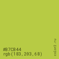 Цвет #B7CB44 в цветовой модели RGB обозначается тремя октетами (183, 203, 68) в десятичном формате и #B7CB44 в шестнадцатиричном (hex) формате, которые являются интенсивностью красного 183 (hex B7), интенсивность зелёного 203 (hex CB) и интенсивность синего 68 (hex 44).
