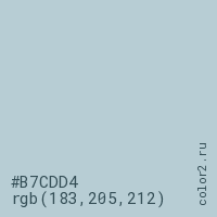 Цвет #B7CDD4 в цветовой модели RGB обозначается тремя октетами (183, 205, 212) в десятичном формате и #B7CDD4 в шестнадцатиричном (hex) формате, которые являются интенсивностью красного 183 (hex B7), интенсивность зелёного 205 (hex CD) и интенсивность синего 212 (hex D4).