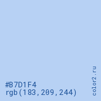 Цвет #B7D1F4 в цветовой модели RGB обозначается тремя октетами (183, 209, 244) в десятичном формате и #B7D1F4 в шестнадцатиричном (hex) формате, которые являются интенсивностью красного 183 (hex B7), интенсивность зелёного 209 (hex D1) и интенсивность синего 244 (hex F4).