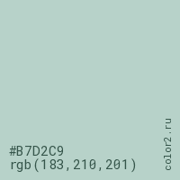 Цвет #B7D2C9 в цветовой модели RGB обозначается тремя октетами (183, 210, 201) в десятичном формате и #B7D2C9 в шестнадцатиричном (hex) формате, которые являются интенсивностью красного 183 (hex B7), интенсивность зелёного 210 (hex D2) и интенсивность синего 201 (hex C9).