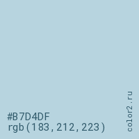 Цвет #B7D4DF в цветовой модели RGB обозначается тремя октетами (183, 212, 223) в десятичном формате и #B7D4DF в шестнадцатиричном (hex) формате, которые являются интенсивностью красного 183 (hex B7), интенсивность зелёного 212 (hex D4) и интенсивность синего 223 (hex DF).