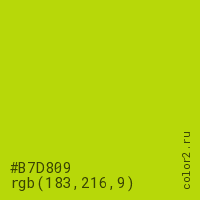 Цвет #B7D809 в цветовой модели RGB обозначается тремя октетами (183, 216, 9) в десятичном формате и #B7D809 в шестнадцатиричном (hex) формате, которые являются интенсивностью красного 183 (hex B7), интенсивность зелёного 216 (hex D8) и интенсивность синего 9 (hex 09).